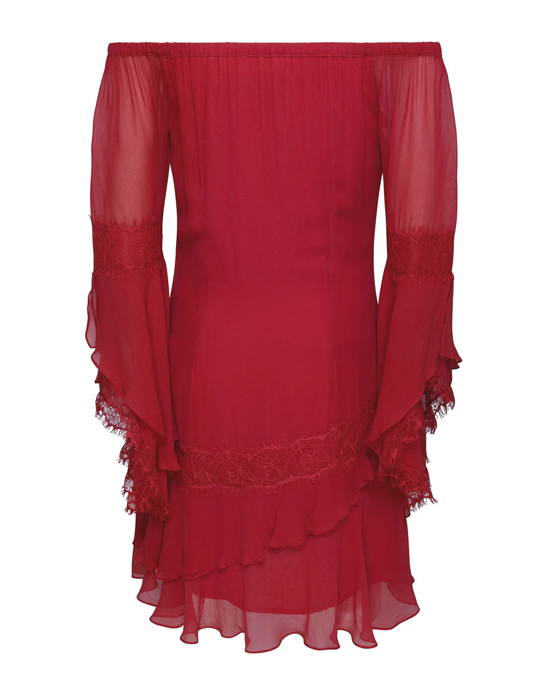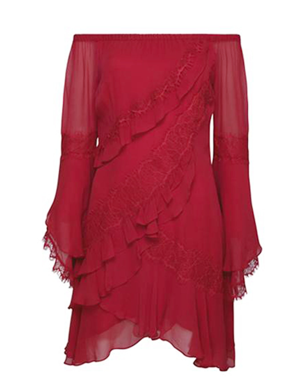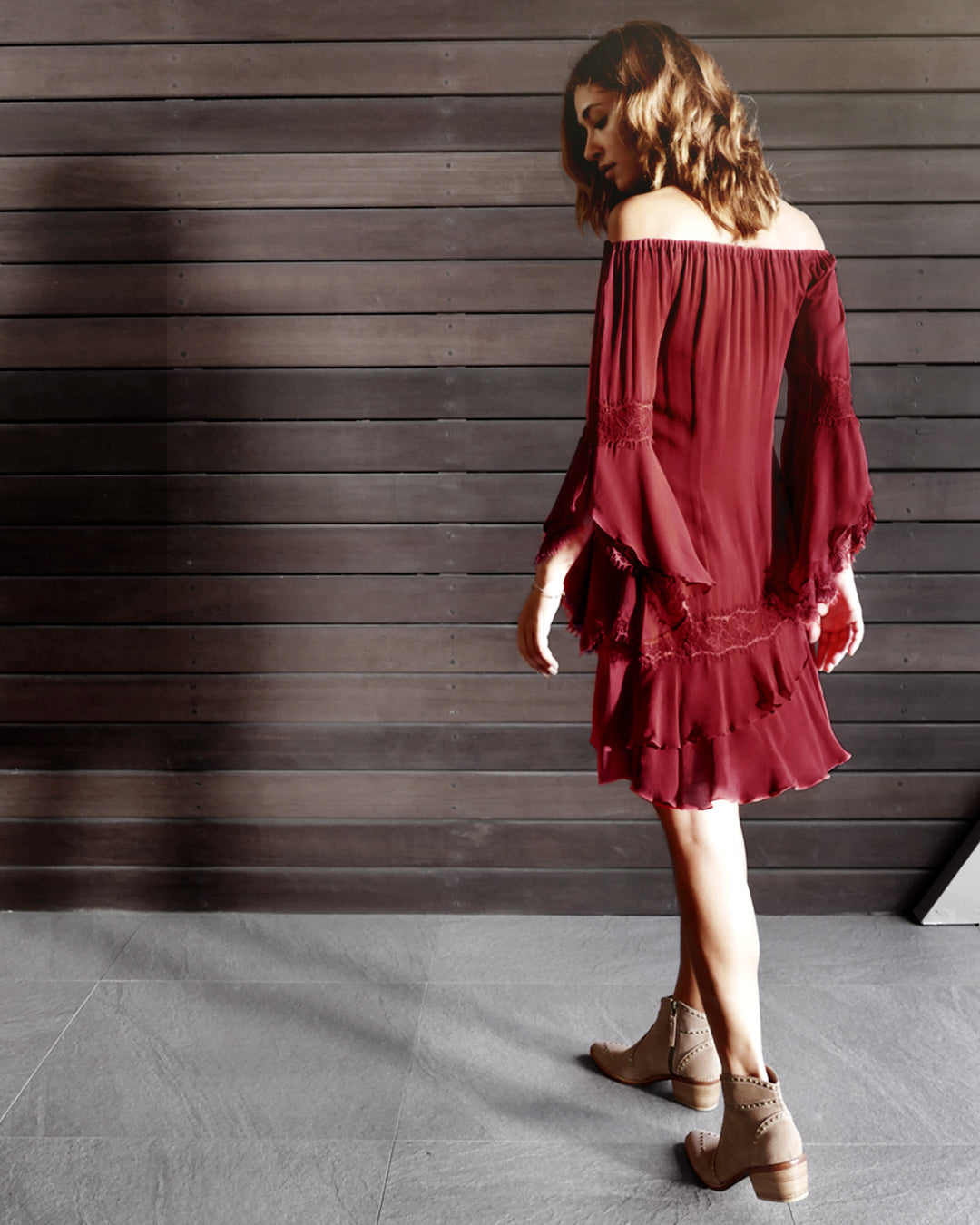 This Little Joe Woman by Gail Elliott dress is your evening essential. The Perfect Feeling off-the-shoulder dress features gypsy style, layered open-bell sleeves with delicate lace edging. The silhouette is ultra-feminine, with a ruffled hem adding a feminine touch. This stunning dress looks perfectly feminine worn with Aspen sandals in the warmer weather, or with the Nevada leather jacket thrown over your shoulders and Hitchhiker boots through the Fall months.