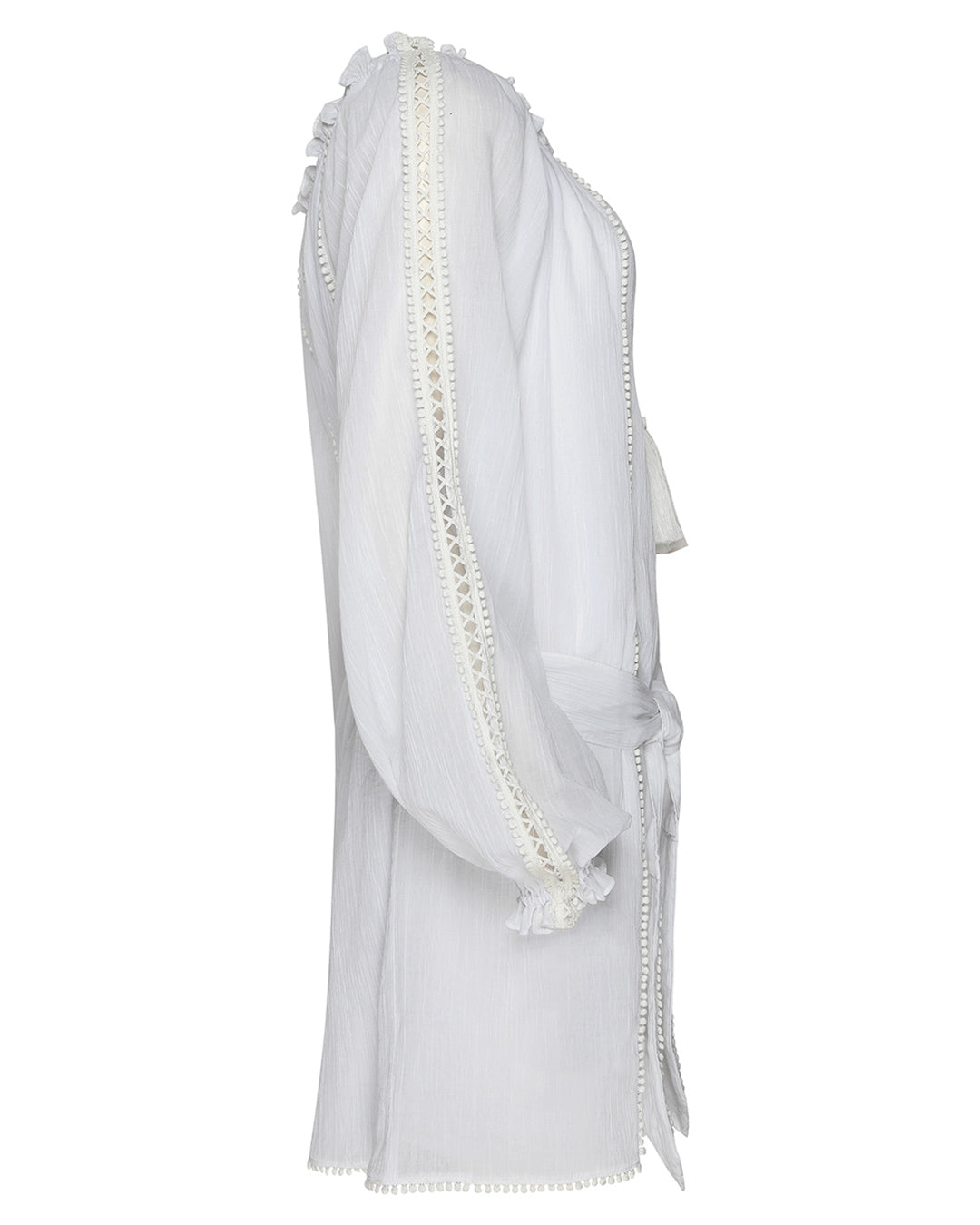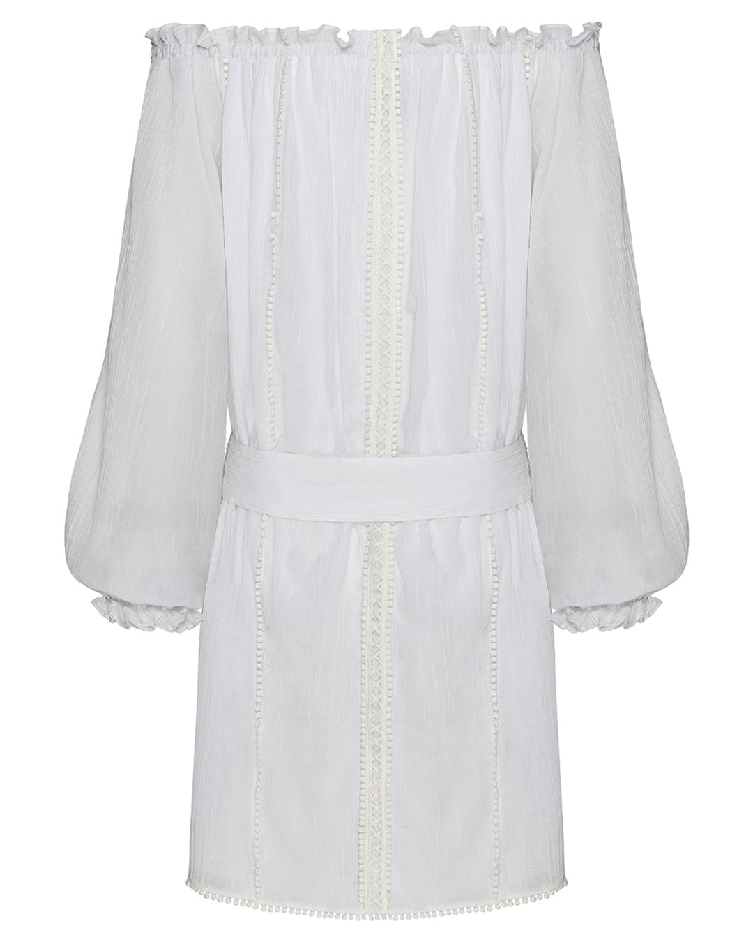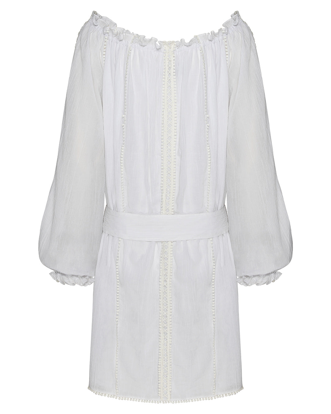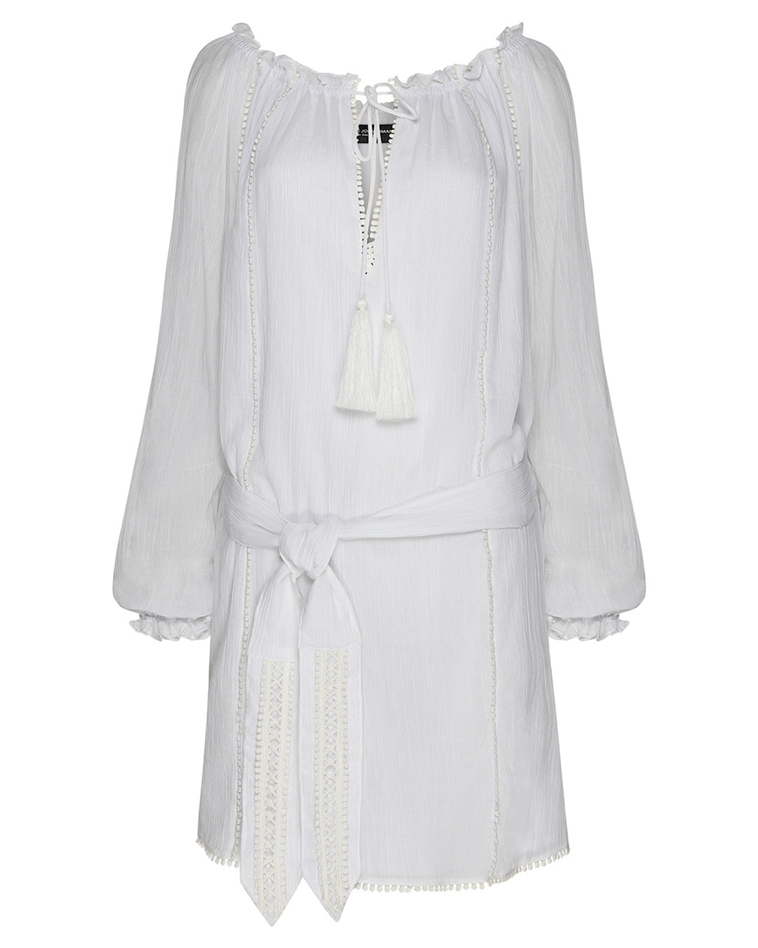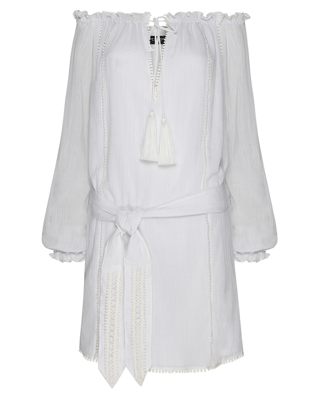 Featuring raglan shoulders with bishop sleeves, lace trimmed keyhole detail, tassels and elasticated neckline with edging, which can be worn on or off the shoulder. Creating a versatile boho-luxe, model off duty look.